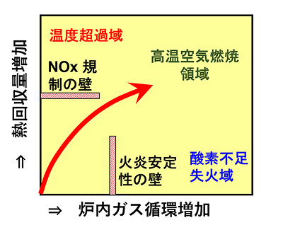 工業炉の加熱性能を向上させる際、省エネ、低NOx、均一加熱が目標となります。省エネには排熱回収量の増加が有効ですが、NOx発生のリスクも増大させます。一方、NOx低下と均一加熱のためには炉内排ガス循環の増加が効果的ですが、これは火炎の不安定化リスクを伴います。
