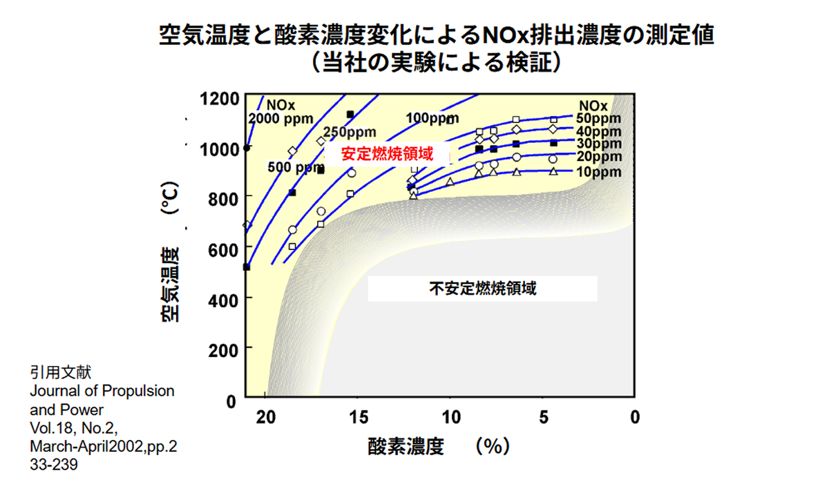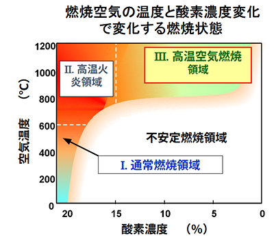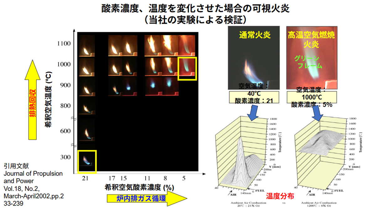 熱回収と炉内排ガス循環の両方を極端に増加させ、空気を800℃以上に予熱し、酸素濃度を5%まで下げた条件で実験を行った結果、この条件下でも安定燃焼し、低NOxと均一な温度分布が実現することが見出されました。そして、この燃焼現象は高温空気燃焼と名付けられました。
